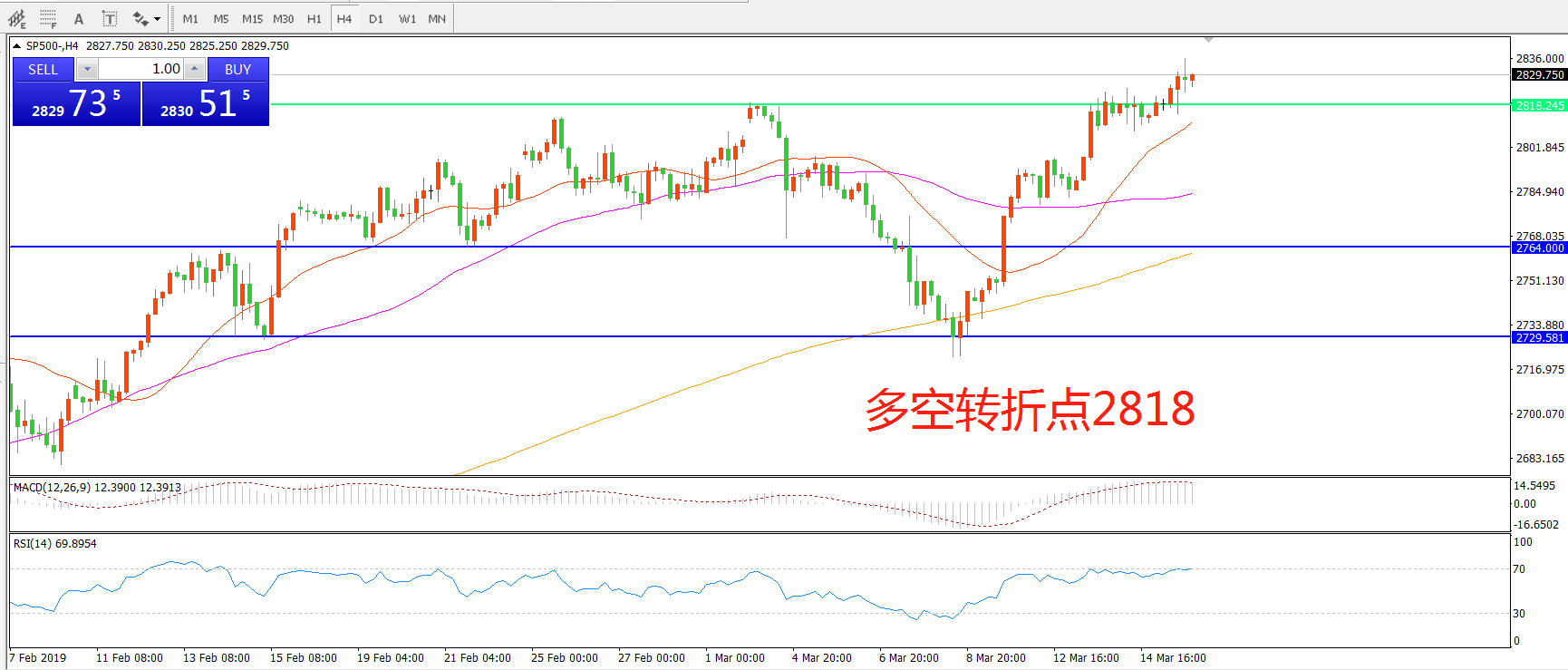 4小时图看,标普500突破2818阻力后强势上行,整体形态偏多,均线系统呈多头排列,MACD红柱增加,RSI指标掉头向上,日内延续上行概率较大。