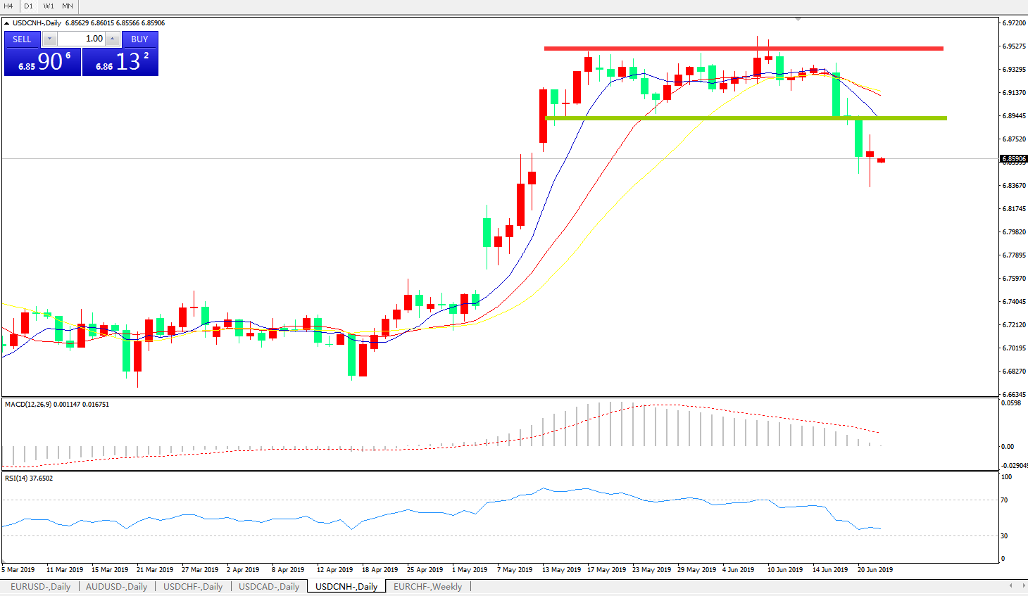 技术面简析:日线均线发散下行MACD逼近0轴且动能柱几无量能RSI逐步走低,在贸易争端缓解及G20乐观预期推动下,汇价大概率将进一步走低