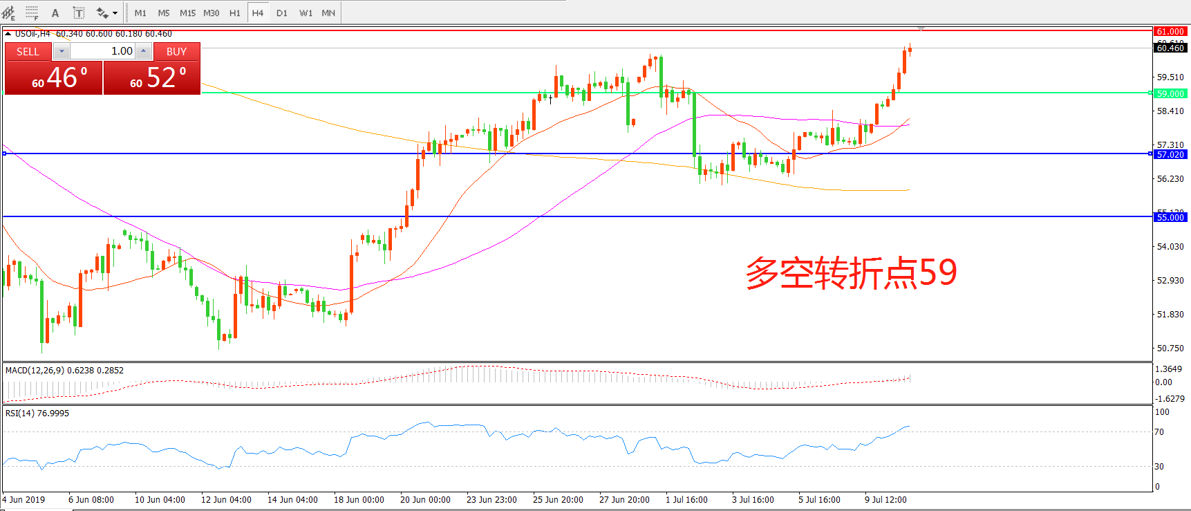 4小时图看,油价阳线连续上行,短期走势走偏强,21周期均线上穿形成金叉, MACD红柱增加, RSI指标向上,60美金关口如能站稳,日内延续上行概率较大。