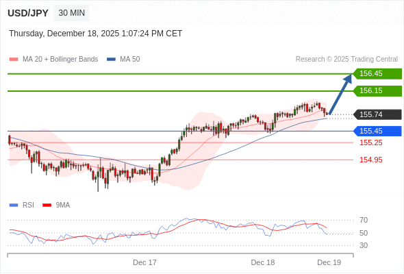 在 155.45 之上,看涨,目标价位为 156.15 ,然后为 156.45 。