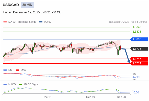 美元/加元 当日内 : 看跌,在 1.3806 之下。
