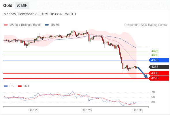 在 4375 之下,看跌,目标价位为 4300 ,然后为 4270 。