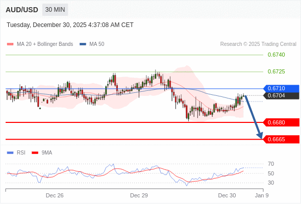 在 0.6710 之下,看跌,目标价位为 0.6680 ,然后为 0.6665 。