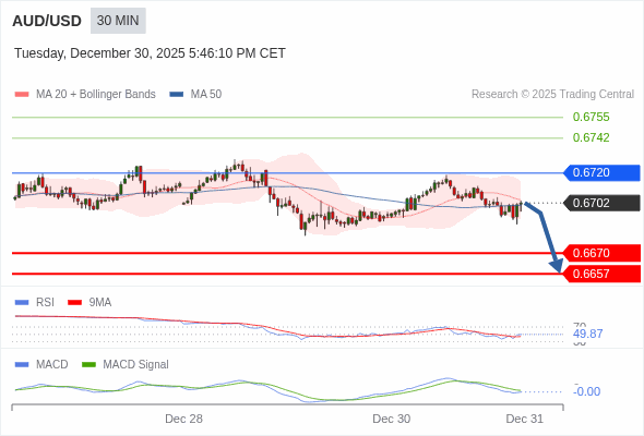 交易策略: 当 0.6720 维持阻力位时,看跌,目标锁定在 0.6657 。