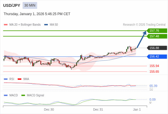 交易策略: 看涨,当 156.42 为支撑位,目标定在157.76。