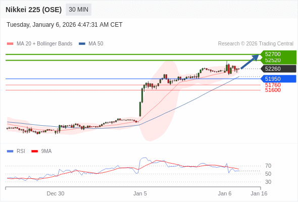 日经225股指期货 (OSE) 当日内: 在51950之上,看涨。