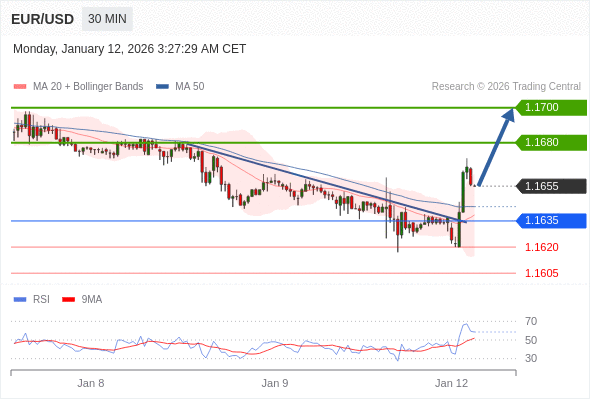 欧元/美元 当日内: 在1.1635之上,看涨。