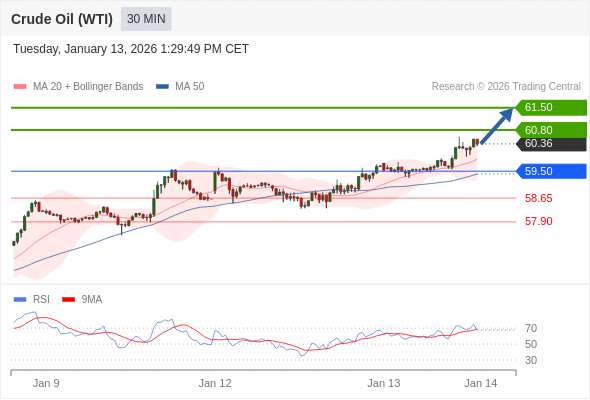 在 59.50 之上,看涨,目标价位为 60.80 ,然后为 61.50 。