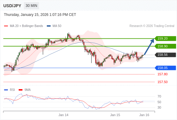 在 158.05 之上,看涨,目标价位为 158.90 ,然后为 159.20 。