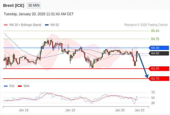 在 64.30 之下,看跌,目标价位为 63.25 ,然后为 62.75 。