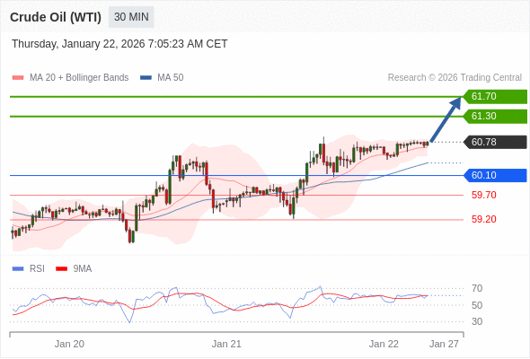在 60.10 之上,看涨,目标价位为 61.30 ,然后为 61.70 。
