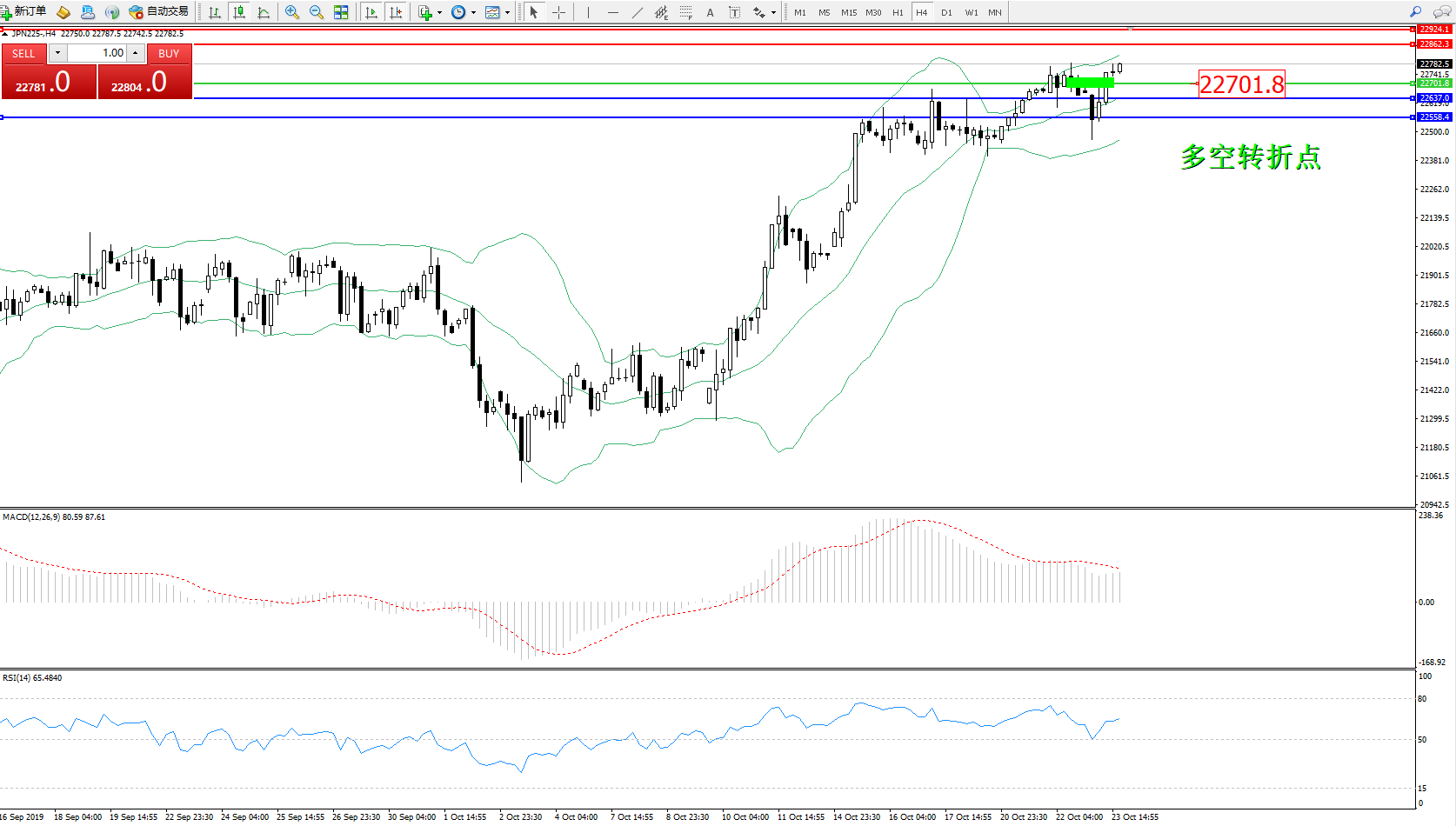 日经225指数1023日(周三)收盘上涨101.60点,涨幅0.45%,报22650.50点。受到全球经济放缓以及贸易形势的影响,日本 9 月进出口规模再度双双回落,其中出口已经是连续第 10 个月同比下滑。市场臆测,日本央行会在 10 30 日、31 日为期二天的会议当中释出宽松政策,因为在上回评论利率时,日本央行表示将会全面检视目前海外风险升高是否已经造成日本原本就已脆弱的经济复苏脱离常轨。日本央行总裁黑田东彦表示,如果有必要祭出宽松货币政策,日本央行当然会调降短期至中期的利率。