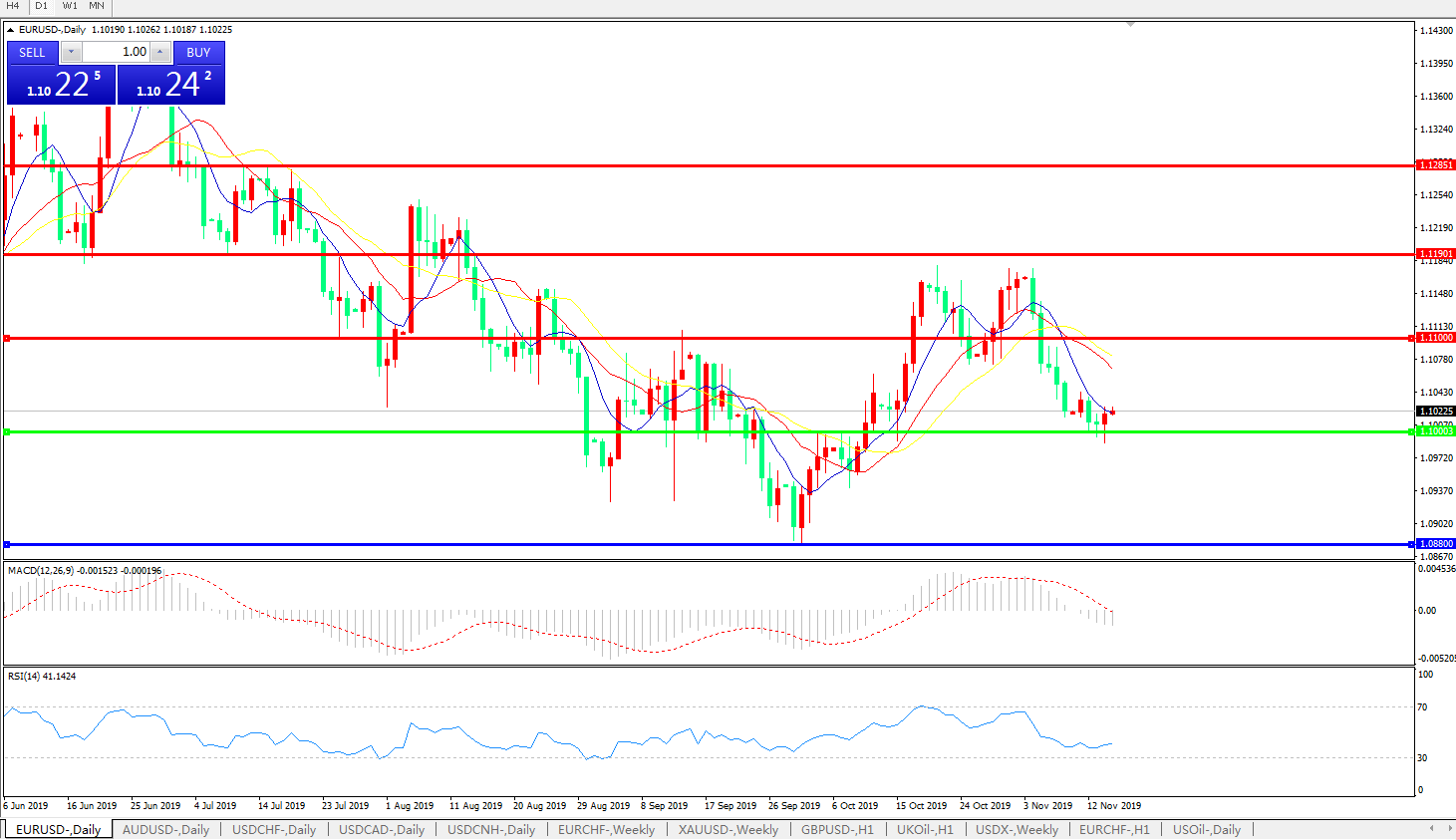 欧元兑美元在周四延续隔夜颓势,承压于1.10关口上下,因日内全球风险情绪进一步因为亚太地区的低迷经济数据趋于恶化,投资者同时对于欧元区的经济表现也仍不看好,并因而继续押注欧洲央行有进一步宽松预期。 虽然,日内发布的德国GDP数据显示该国经济在三季度意外录得0.1%的环比增长,连续两个季度负增长从而陷入技术性衰退,但该数据却未能引领欧元汇价走出泥潭。因为虽然德国经济避免衰退,但是其增长低迷的格局却并未有实质性变化。因此,对欧洲央行强化宽松的预期仍旧存在; 此外,隔夜美联储主席鲍威尔也再度宣称美国经济面临“外部风险”,欧元区经济低迷状况显然无法为各界所忽略。虽然评级机构穆迪试图给市场打强心针,宣称未来两年全球经济没有衰退风险。但与德国GDP数据一样,如此“利好”程度尚不足以把欧元汇价带出当前的下行轨道