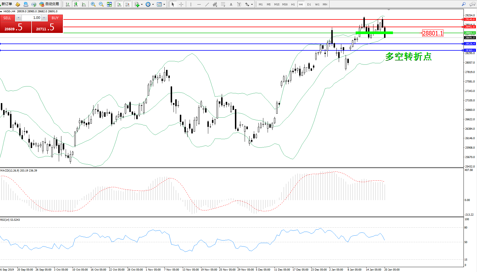 香港恒生指数120日(周一)收盘下跌260.51点,跌幅0.90%,报28795.91点;跌破29000点,午后恒指跌幅进一步扩大。截至收盘,恒指跌0.9%,报28795.91点。港股市场呈下跌行情,主要股指弱势走低。因新型冠状病毒肺炎情况发酵,市场流感概念股全线上涨,在弱势行情下,表现尤为亮眼。5G进程或加快,相关电信股股亦逆势走强。流感概念股全线大涨,东阳光药涨超19%,白云山涨9%,中国中药涨超8%,四环医药、同仁堂科技皆涨。全球景气周期可能逐步见底,流动性整体仍然宽松,资金流入股市的趋势仍在继续,市场整体估值并不高,港股估值相对更具吸引力。