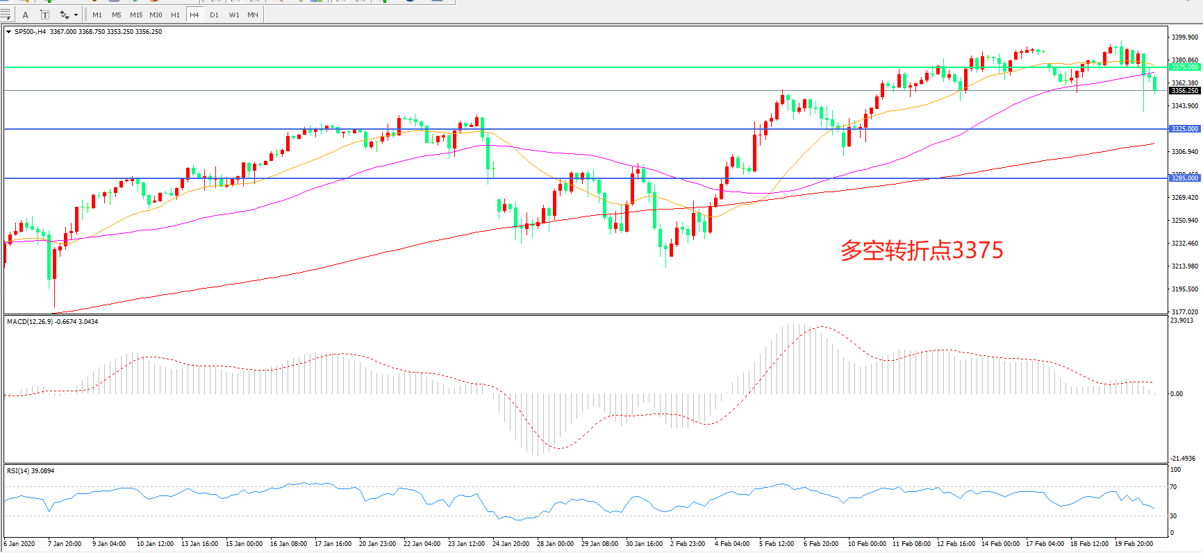 4小时图看,标普500冲高回落,短期涨势遭到破坏,但上行形态依然完整,均线系统走平,MACD红柱减少,RSI指标向下,日内延续震荡概率较大。