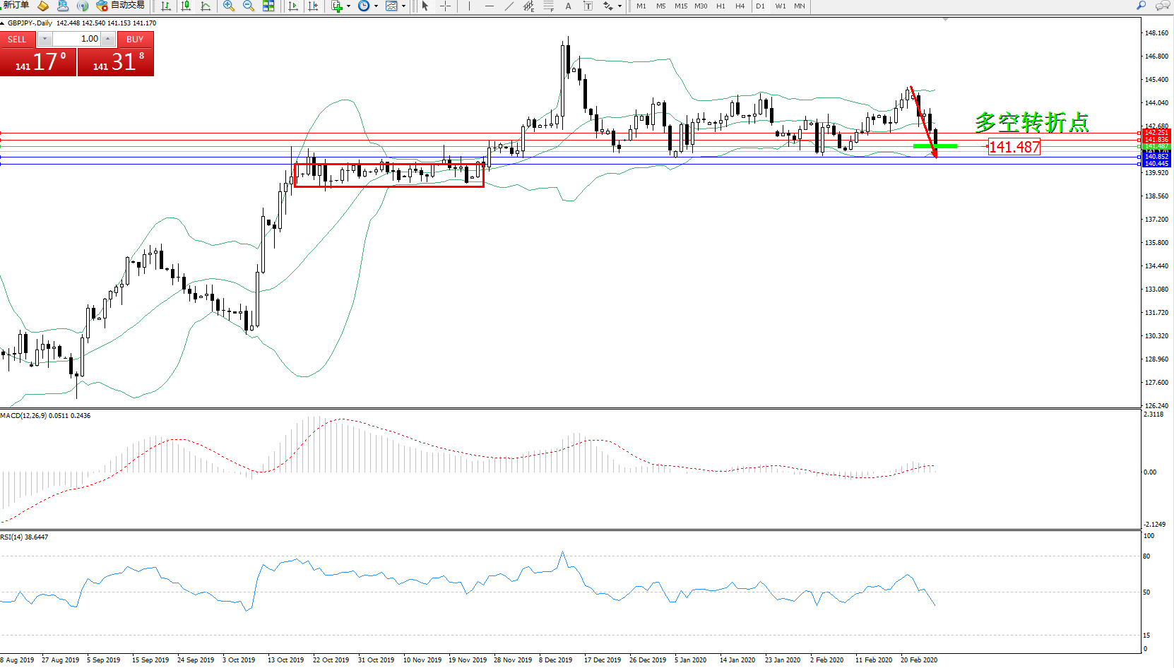 交易策略:141.487下方看跌,目标140.852、140.445
