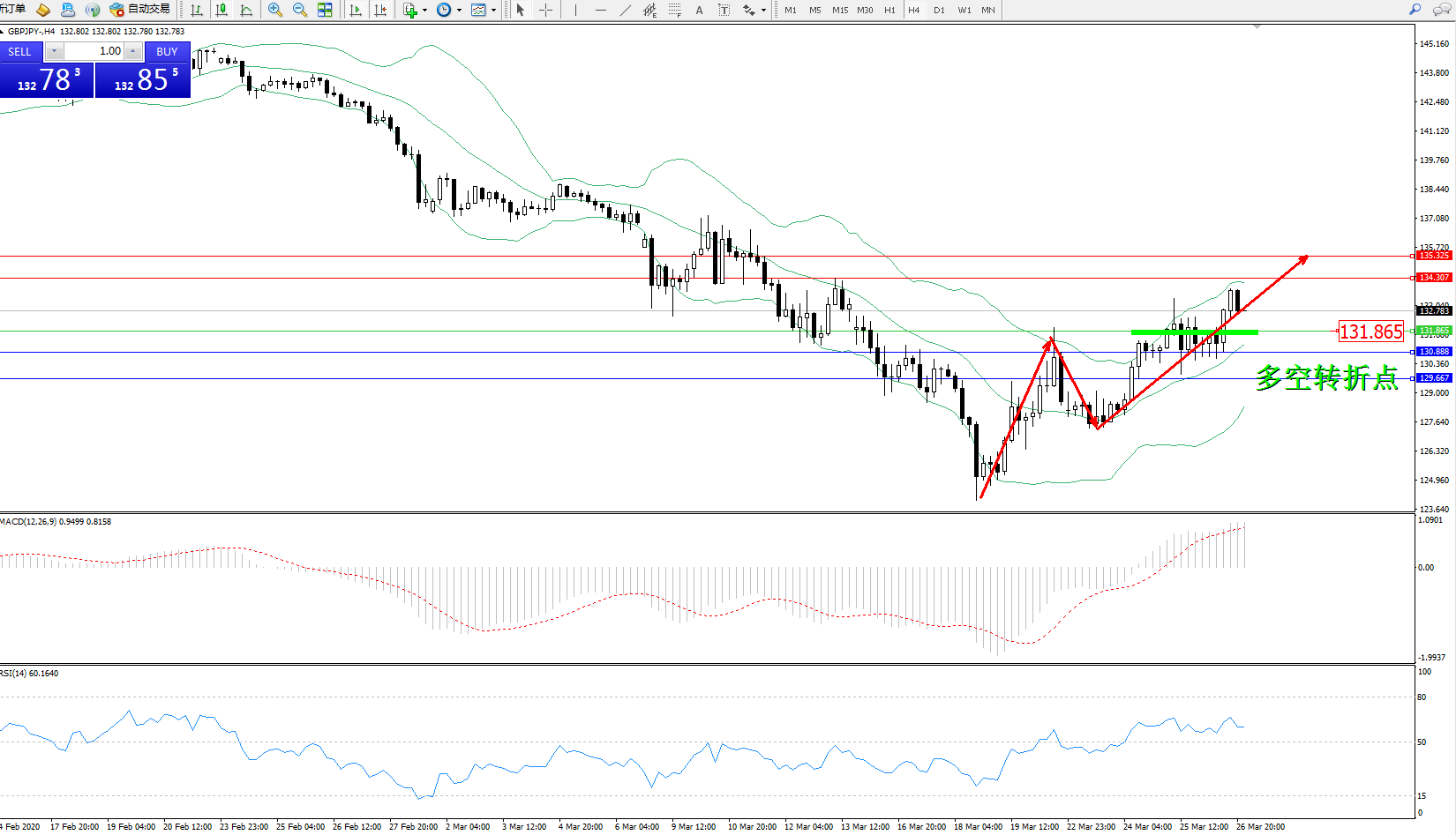 交易策略:131.865上方看涨,目标134.307135.325
