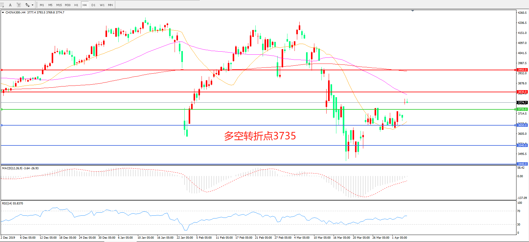 4小时图看,沪深300高开高走,突破前期整理区间,整体表现较为强势,短期均线拐头向上,MACD绿柱缩短,RSI指标走平,日内延续上行概率较大。