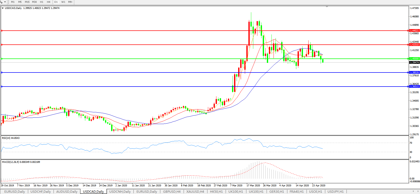 交易策略: 在1.4000之下,看跌,目标价位为1.3800、1.3600