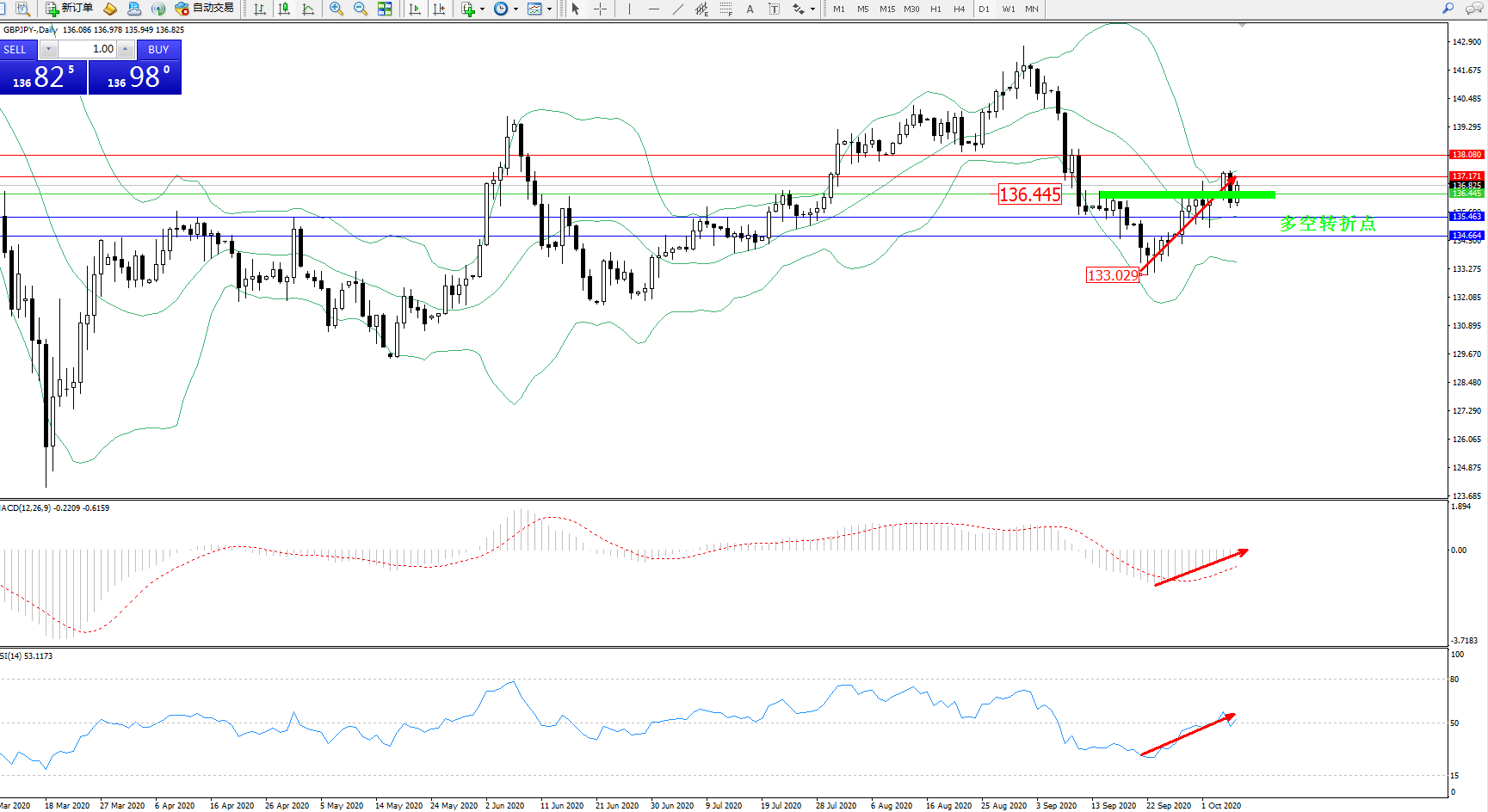 备选策略:136.445上方看涨,目标137.171、138.080