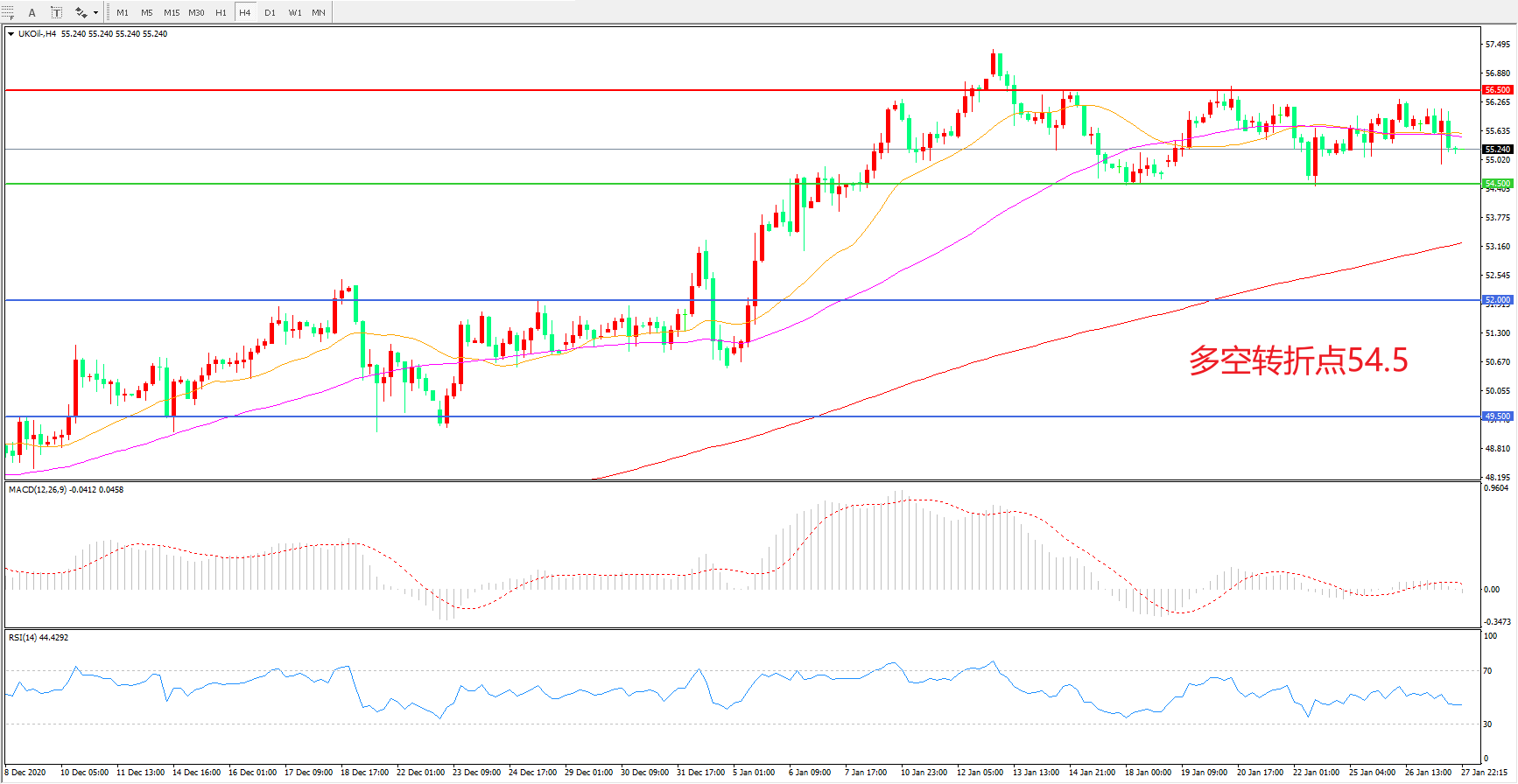 交易策略:  在54.50之上看涨,目标56.50    60.00