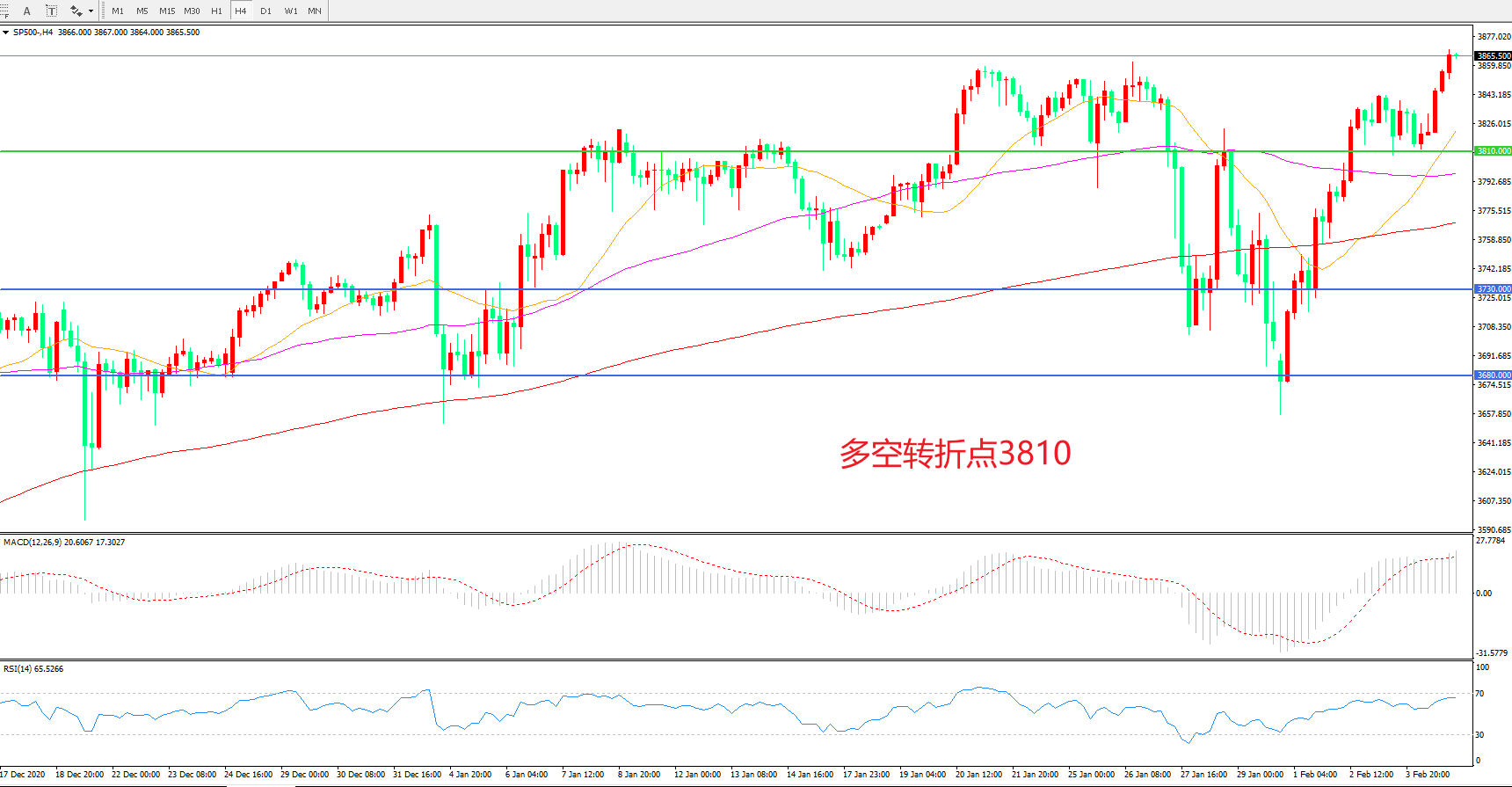 4小时图看,标普500长阳拉升,短期走势回暖,3810成为下方明显支撑,短期均线拐头向上,MACD红柱增加,RSI指标走平,日内震荡上行概率较大。