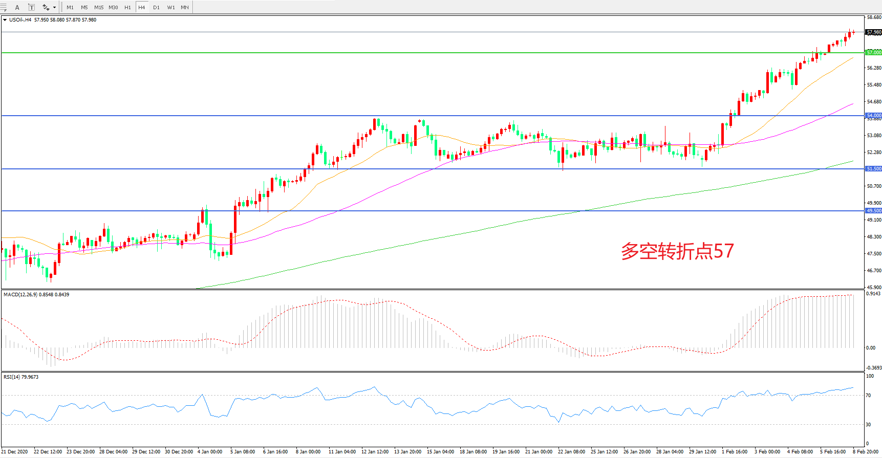 4小时图看,油价连续拉升,整体表现偏强,57阻力被快速突破,多头趋势已经形成,MACD红柱增加,RSI指标向上,日内延续上行概率较大。