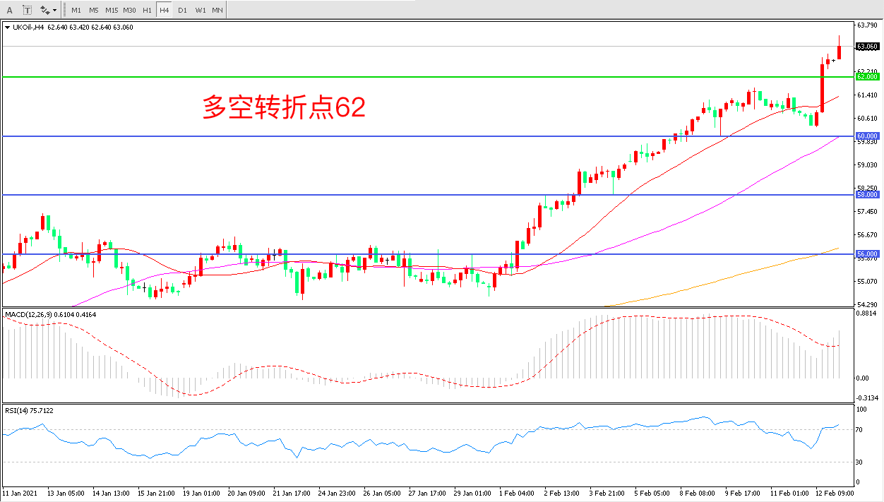 4小时图看,油价连续上涨后再度突破,上行趋势十分明显62美元被顺势突破行情进入加速阶段MACD红柱增加RSI指标向上,日内延续上行概率较大。
