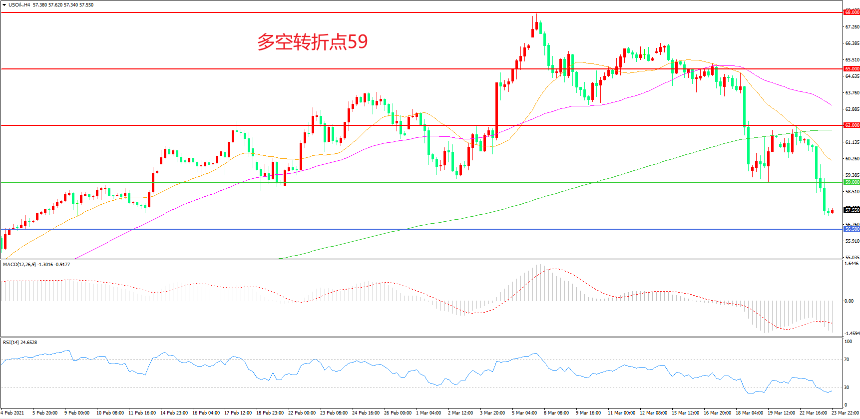 周二(3月23日),涨势熄火的油价再次面临供应和需求的“两面夹攻”,市场避险情绪再度升温,美国WTI原油单边下行,暴跌逾6%后收报57.55美元/桶。在亚洲疫情逐渐消退的情形下,欧洲疫情却有卷土重来的迹象,一系列新的抗疫措施使得原油消费的前景蒙上一层阴影,而美联储主席鲍威尔在出席国会听证时称“有些资产价格有些高”,也打压了市场中的风险情绪。