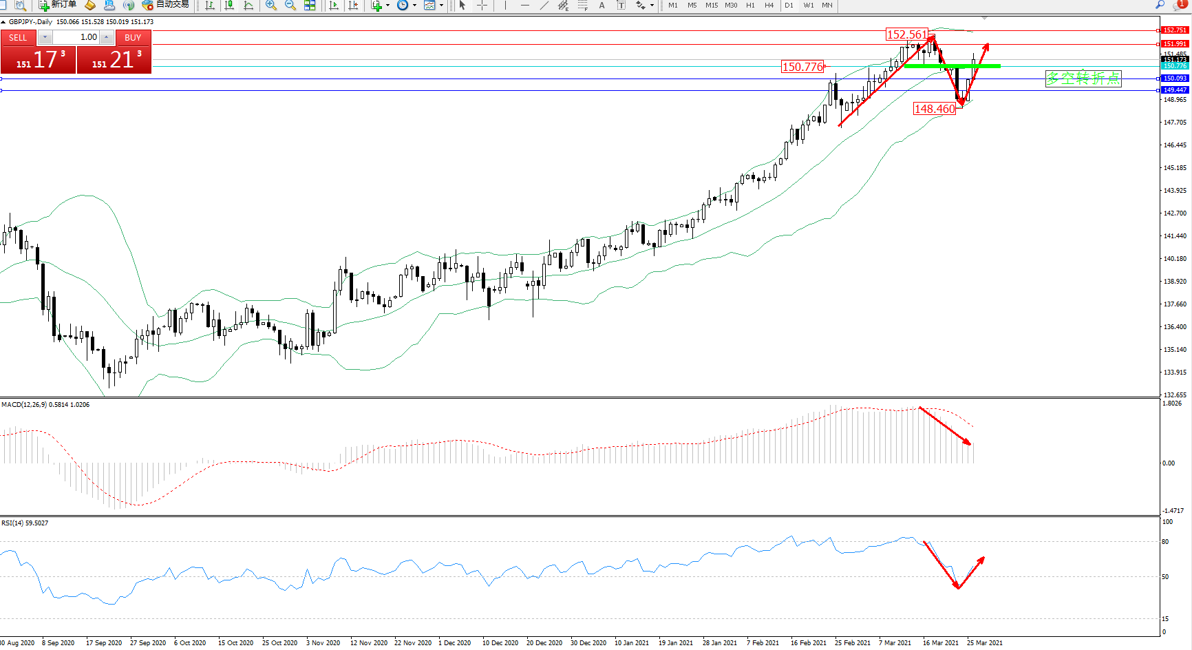 交易策略:150.776上方看涨,目标151.991、152.751