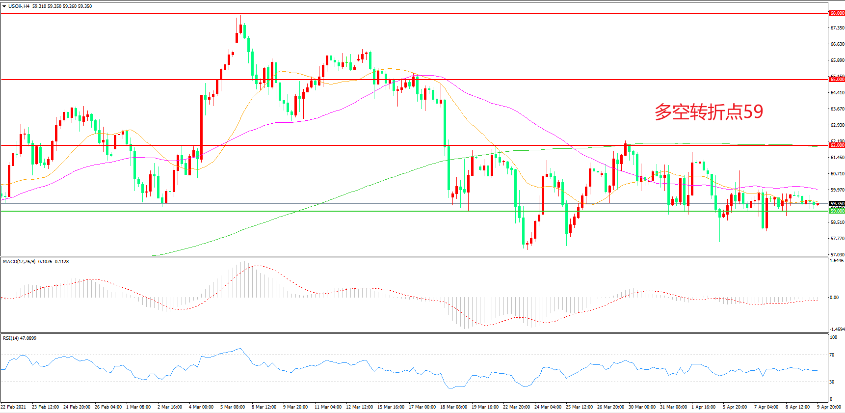 4小时图看,油价先涨后跌,区间震荡迹象明显,反弹高点逐渐减低,59美元成为短期支撑,MACD红柱增加,RSI指标走平,日内延续震荡概率较大。