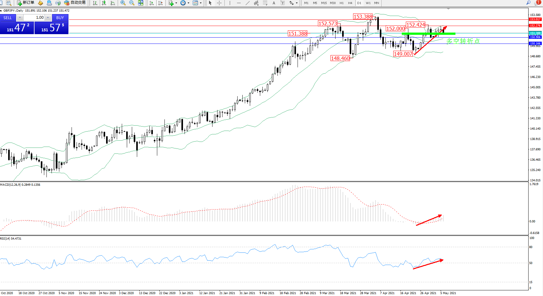 技术点评:长时间维持在布林指标通道宽幅震荡整理持续平移中,多空动力均处于焦灼状态,多次来回试探上下轨区间节点,低位多头再度上移至布林带指标上轨附近破位后抵达152.424位置遇阻维持在中上轨区间震荡中,布林带指标呈收口走势后开始有持续平移迹象,MACD指标处于0轴线上方弱势向上移动中,RSI指标处于50均衡线上方震荡持续中;