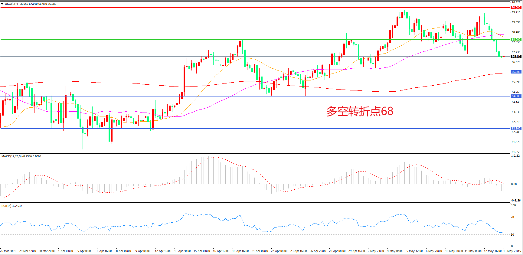 4小时图看,油价长阴连续下破,短期表现低迷,200周期均线成为下方支撑,68美元成为多空分水岭,MACD绿柱增加,RSI指标走平,日内震荡下行概率较大。