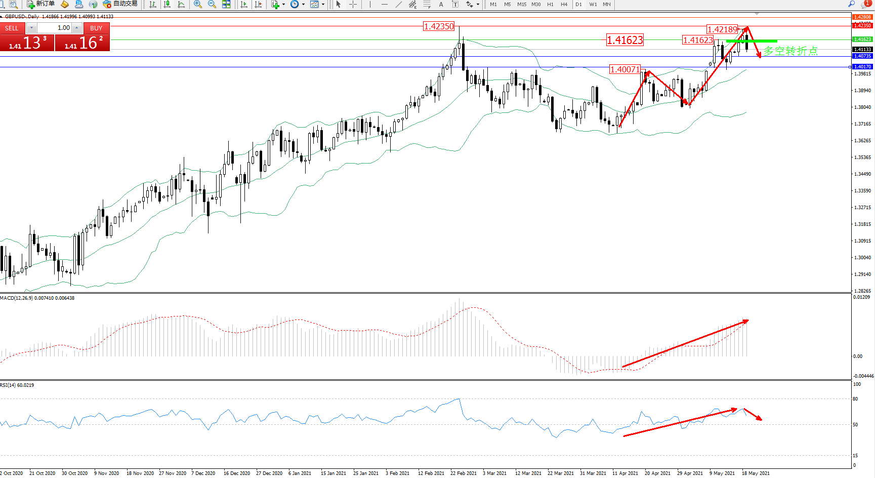 交易策略:1.41623下方看跌,目标1.40735、1.40170