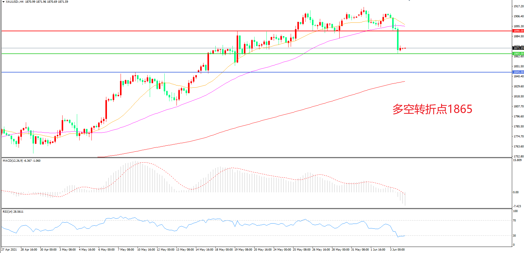 备选策略:在1890.00之下看跌,目标1865.00    1845.00