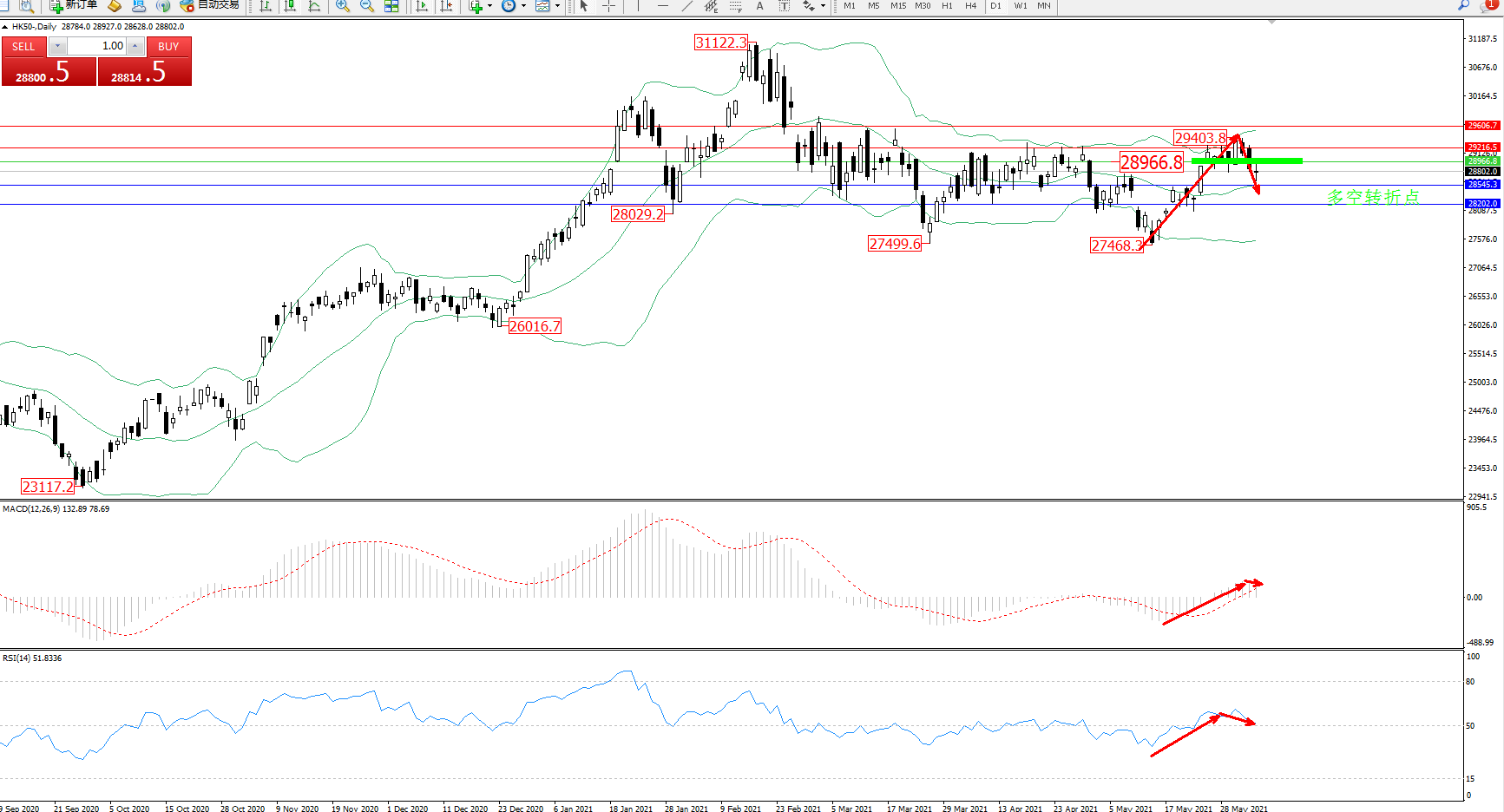恒指HK50 ——日K线图显示: