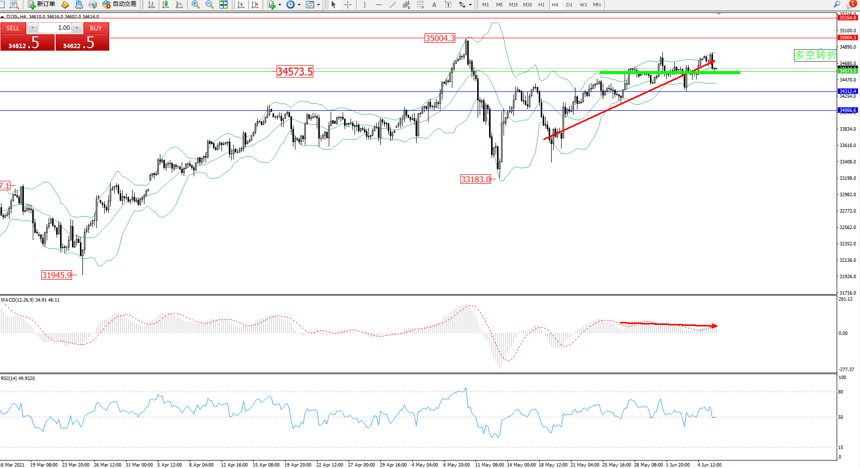 交易策略:34573上方看涨,目标35004、35264