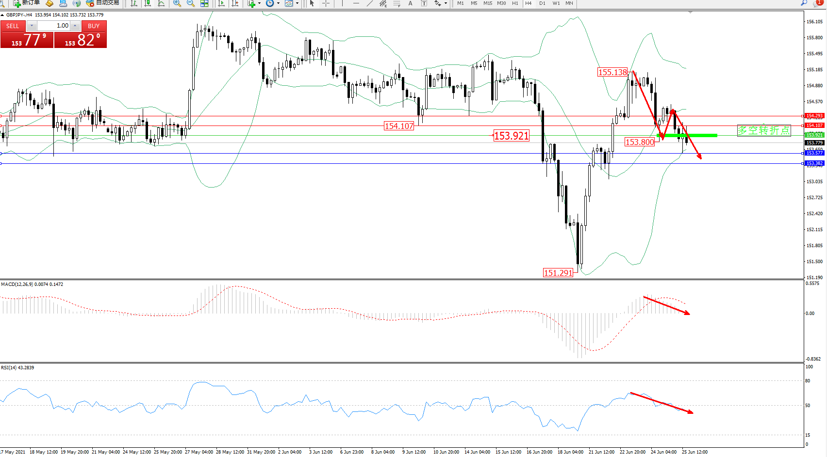 交易策略:153.921下方看跌,目标153.577、153.382