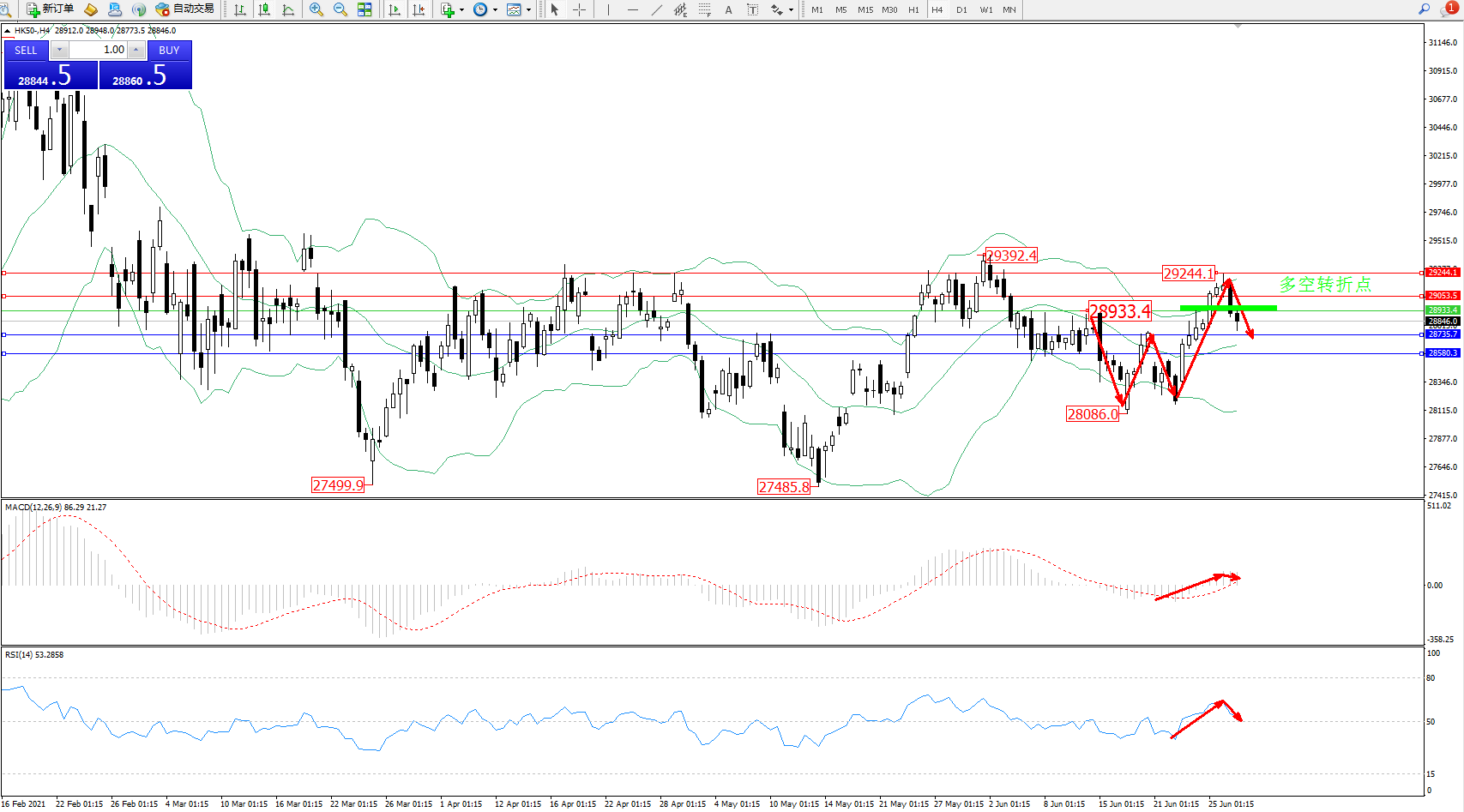 恒指HK50 ——4小时K线图显示: