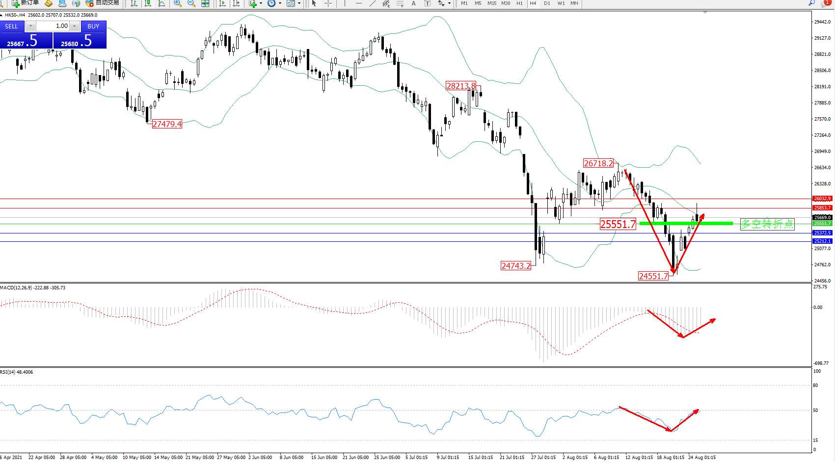 香港恒生指数8月25日(周三)收盘下跌33.97点,跌幅0.13%,报25693.95点;港股三大指数早盘冲高后集体转跌,午后维持低位震荡行情。恒生科技指数涨0.2%报6458点。昨日集体大反弹的科网股走势分化,快手跌3.55%,阿里巴巴跌1.44%,京东续涨5%,网易、美团均上扬;教育股表现强势,新东方大涨逾12%表现最佳;恒大概念股跌幅最大,体育用品股、电信股、餐饮股、燃气股全天表现弱势。今日大市成交额为1633亿港元,南下资金净流入10.57亿港元。据香港经济日报,今年上半年香港及海外资本市场成为内地TMT(科技、媒体与通信)企业的主要上市选择低,有34家内地TMT公司选择在香港及海外上市,获得约1758亿元融资额,占总融资规模的82%。