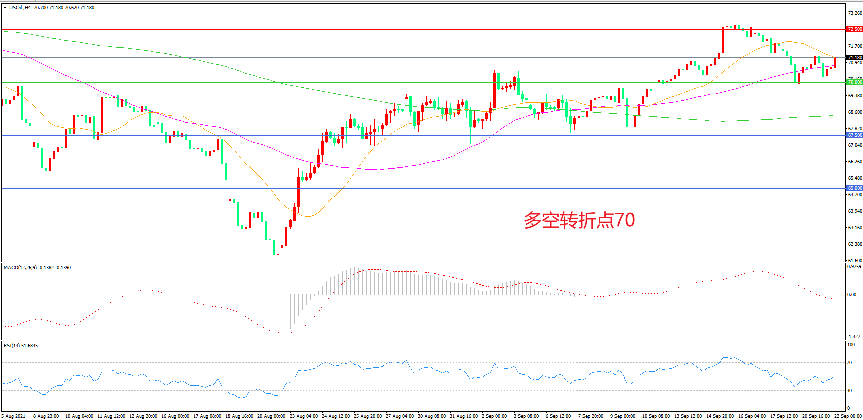 4小时图看,油价整体呈现区间震荡形态,70美元成为短期支撑,72.5美元成为上方阻力,均线系统走平,MACD红柱缩短,日内小幅反弹概率较大。