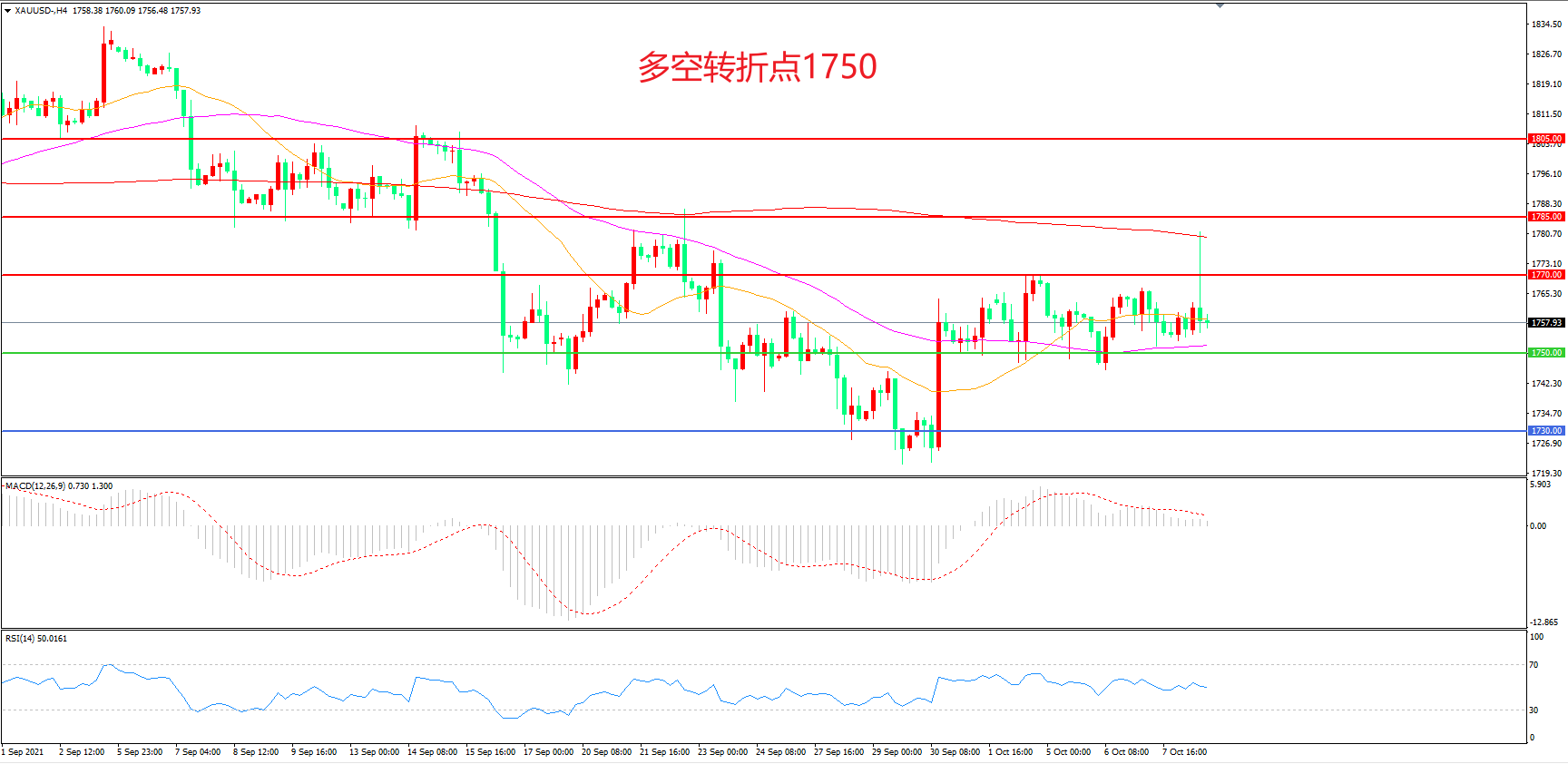 4小时图看,金价冲高回落后区间震荡迹象明显,1750成为下方支撑,200周期均线成为上方阻力,MACD红柱减少,RSI指标走平,日内延续震荡概率较大。