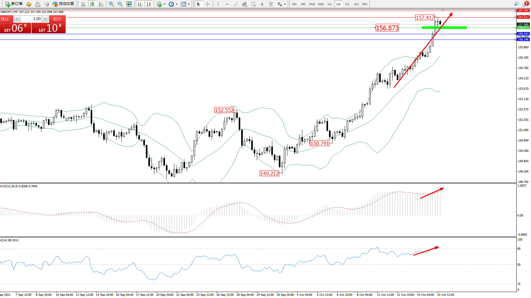 技术点评:多头动力延续布林带指标通道上轨附近持续震荡上扬高位抵达157.417位置短暂整理,多头动力有持续攀升态势,布林带指标呈张口走势持续中,MACD指标处于多头区域维持整理上移中,RSI指标处于多头区域超买区80均衡线上側弱势徘徊;