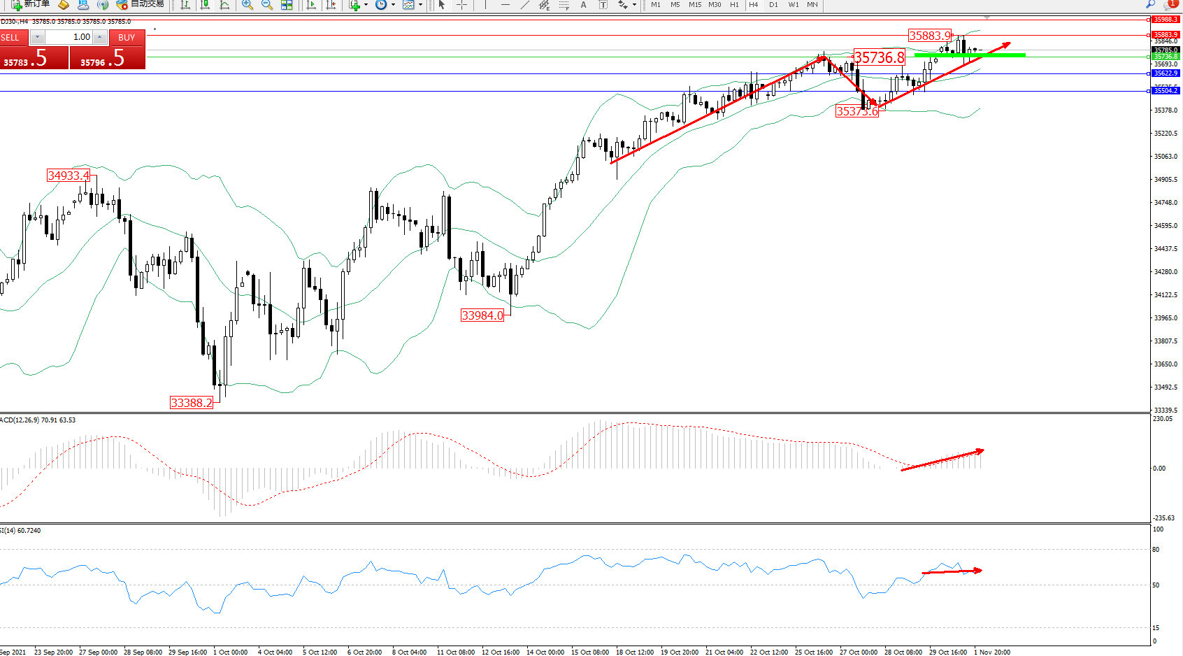 道琼斯指数DJ30——4小时K线图显示: