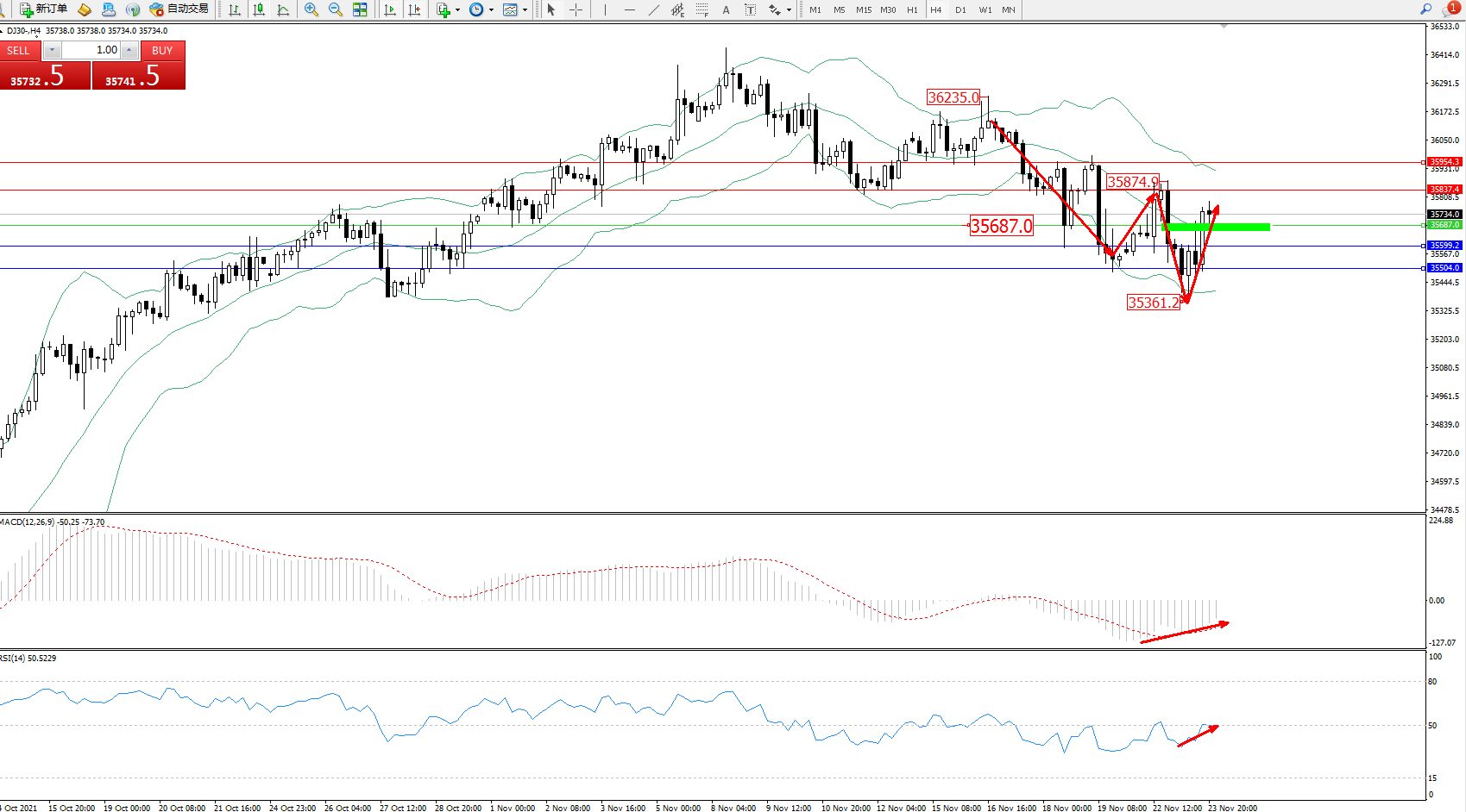 道琼斯指数DJ30——4小时K线图显示: