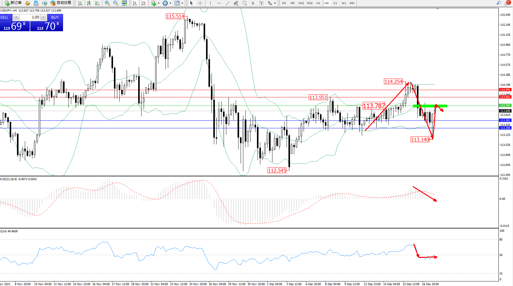 交易策略:113.787下方看跌,目标113.502、113.356