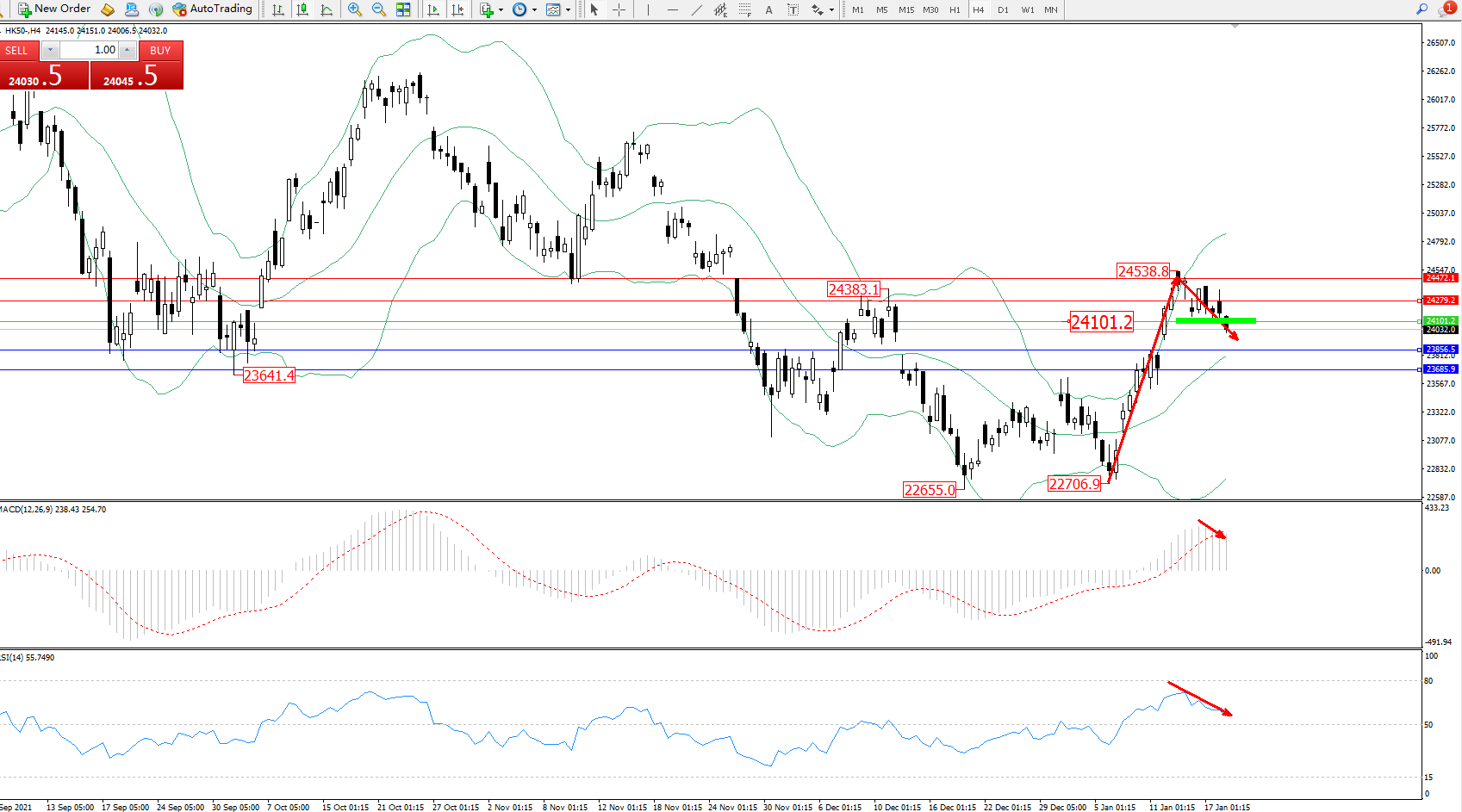 香港恒生指数1月18日(周二)收盘下跌105.25点,跌幅0.43%,报24112.78点;港股主要指数冲高回落,恒生科技指数跌0.45%。大型科技股跌多涨少,腾讯跌近3%,快手、阿里巴巴、京东均跌超1%,小米、百度小幅收涨;昨日大涨的濠赌股走低明显,元宇宙概念股、药品股、燃气股普跌。南下资金逆势净流入30.82亿港元,大市成交额为1123亿港元。香港特区政府卫生署卫生防护中心公布,香港新增11例新冠肺炎确诊病例,其中8例为输入病例。目前,香港累计报告新冠肺炎确诊病例13041例。