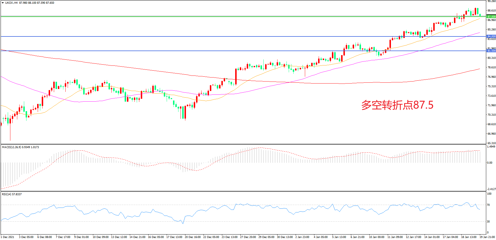 4小时图看,油价低点逐渐抬高,整体表现偏强,均线系统呈多头排列,87.5美元成为多空分水岭,MACD红柱增加,RSI指标走平,日内震荡上行概率较大。