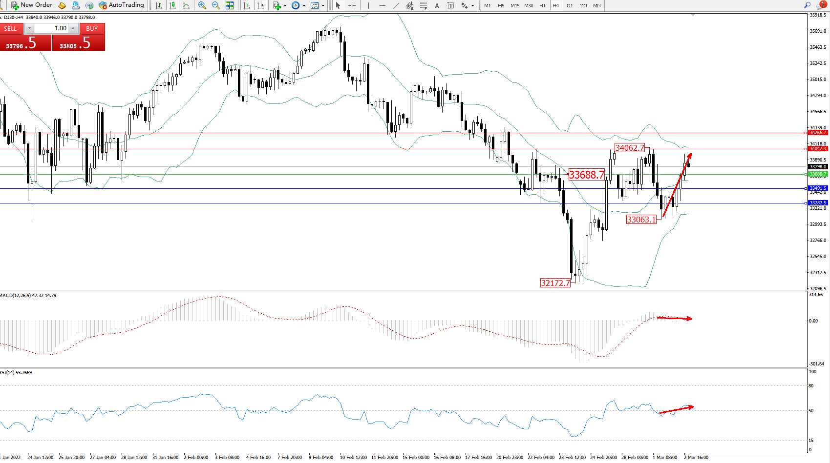 道琼斯指数DJ30——4小时K线图显示: