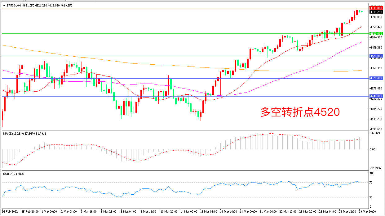 周二(3月29日),俄乌谈判传来积极信号,乌克兰乱局出现缓和迹象,市场风险偏好重燃,标普500延续强势表现,收报4616.25点。尽管俄乌谈判再度传来利好,但人们对炽热的通货膨胀、紧缩的货币政策和冲突可能造成的经济损失的担忧依然挥之不去,今晚,市场将迎来有“小非农”之称的ADP就业数据,务必重点关注。